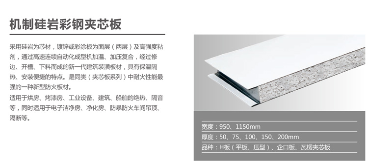 采用硅巖為芯材,鍍鋅或彩涂板為面層(兩層)及高強度粘劑,通過高速連續(xù)自動化成型機加溫、加壓復(fù)合,經(jīng)過修邊、開槽、下料而成的新一代建筑裝潢板材,具有保溫隔熱、安裝便捷的特點。是同類(夾芯板系列)中耐火性能最強的一種新型防火板材。
